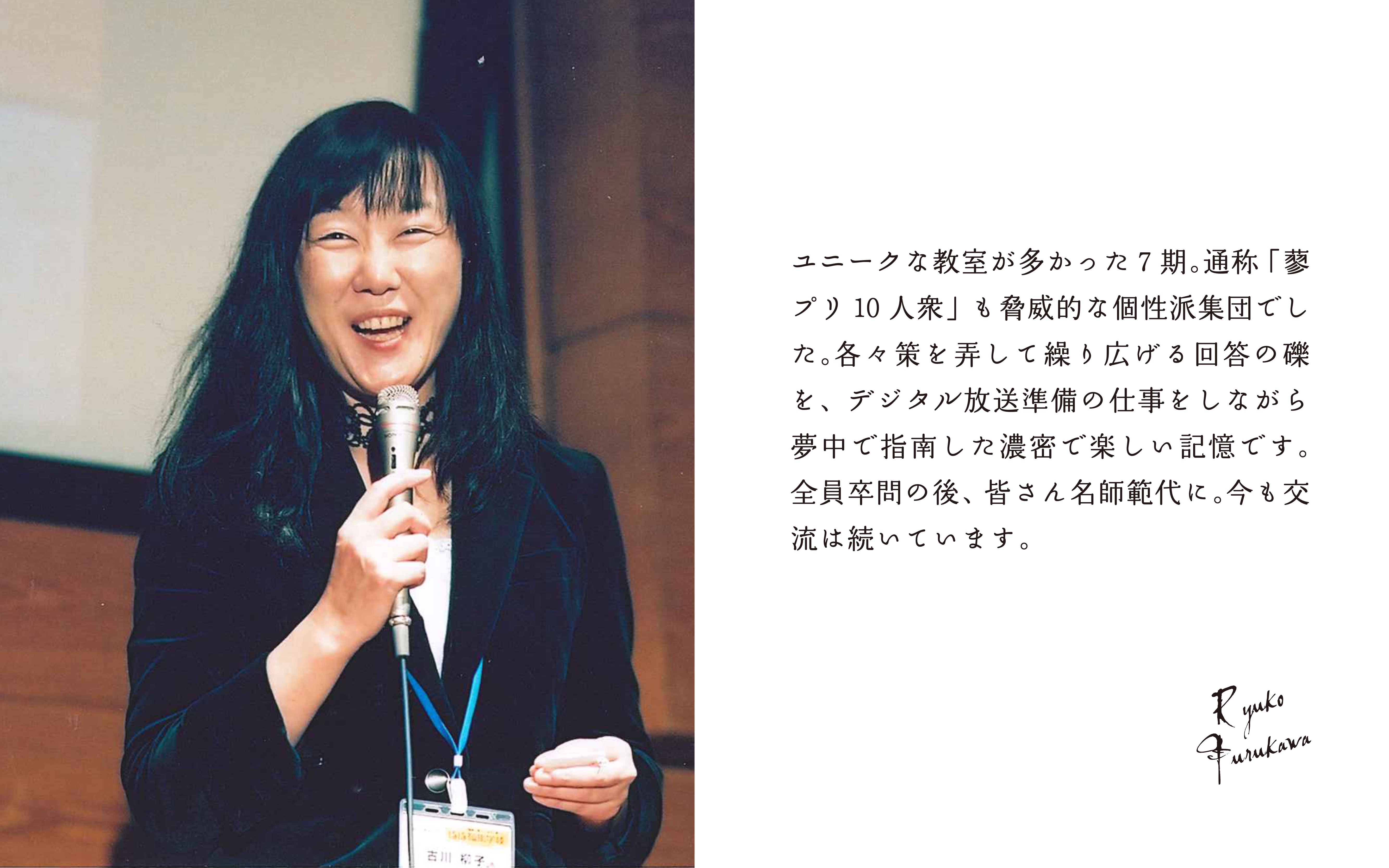 新型肺炎(SARS)が流行し、個人情報保護法が成立する中、2003年12月1日に導入される地上デジタルテレビ放送の準備に奔走していたのはテレビ朝日編成局長(当時)のおりゅうさんこと古川柳子さん。古川さんはデジタル化の渦中での師範代登板となりました。教室には医師、お茶の先生、シャンソン歌手が集い、師範代のたおやかな統率力のもと学衆たちは伸び伸びと編集稽古に遊びました。7期は第1回番期同門祭(後の感門之盟)が青山の草月会館で開催され、会場は満員御礼。卒門を祝った後も毎回異なる企画で汁講を行うほど蓼喰うプリズム教室の縁は長く続きました。