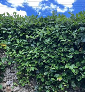 石垣を這いながら蔓をのばすオオゴマダラ幼虫の食草「ホウライカガミ」