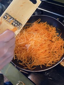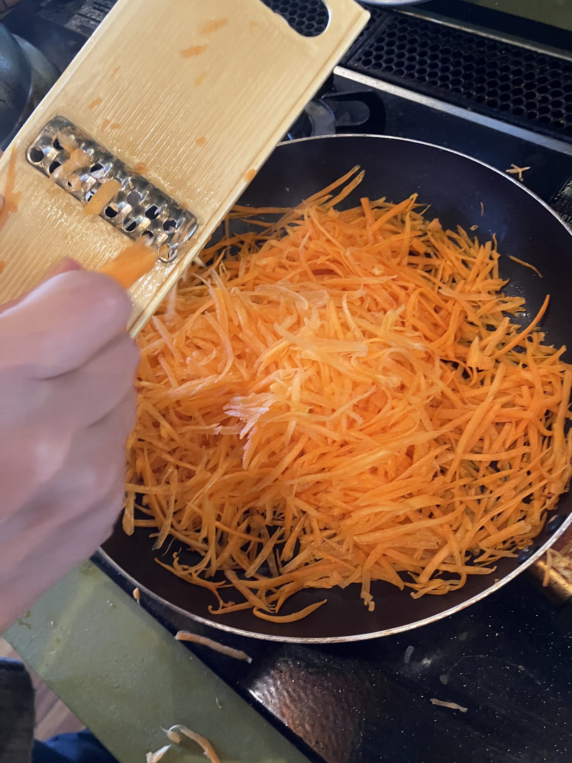 4)1本半ほどシリシリしたところでフライパンに火をつけ(だいたいいつも「あ、油忘れた」と気づき、サラダ油をフライパンのヘリに回し入れる)、残りの人参をシリシリし、しんなりするまで菜箸で炒める。