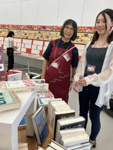 川田淳子BSEの赤いエプロンに誘われて、「猫と量子が見ている」の棚に見入る圓尾友理師範代。初対面の二人だが、3分話すと、もう旧友。