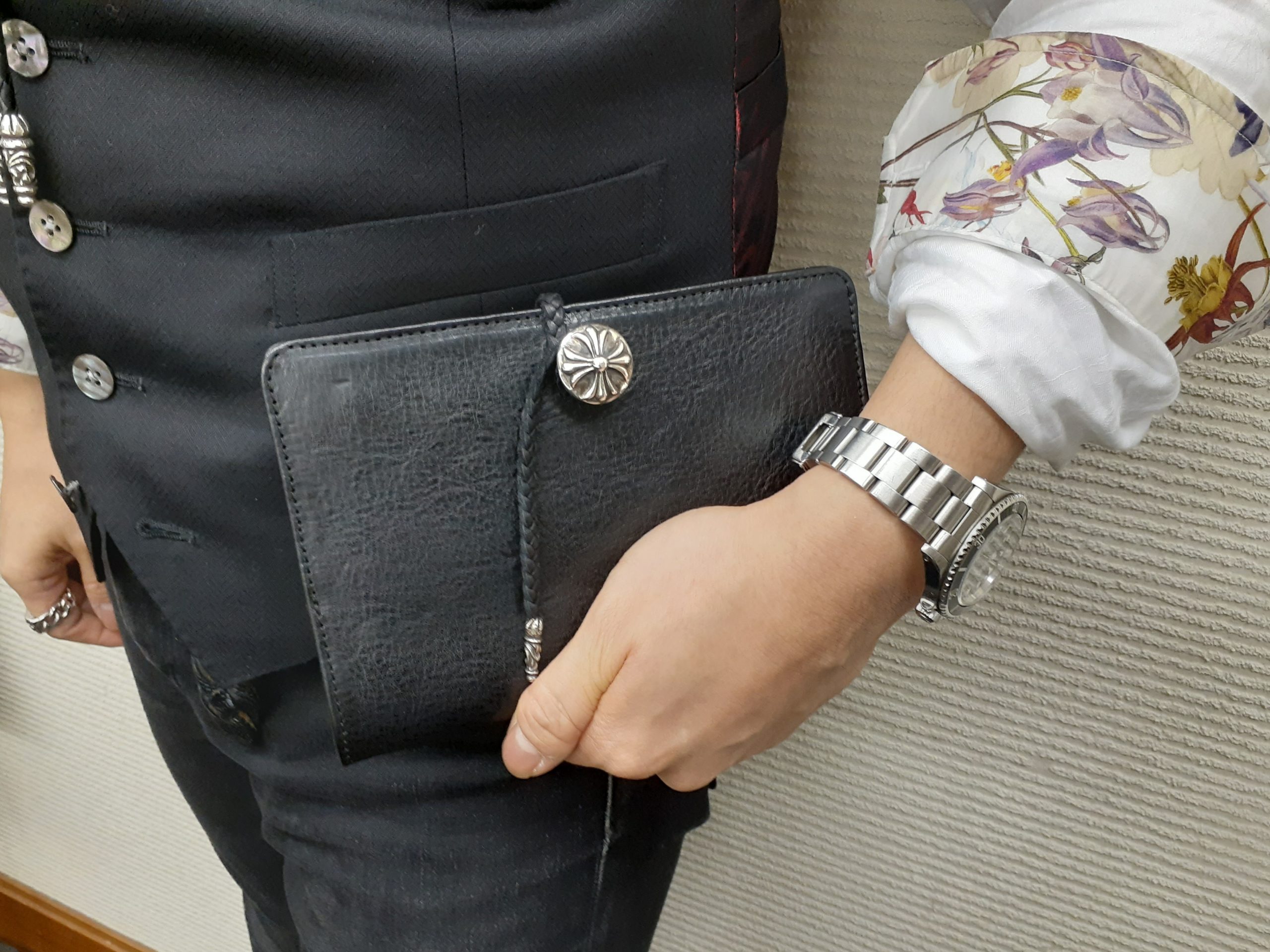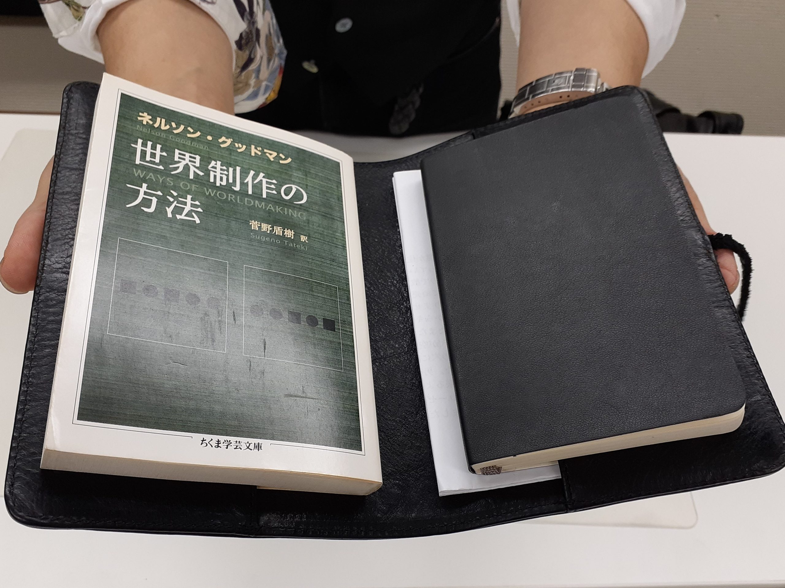 「石油製品がキライ」というイシツ人が愛用している革製の手帳カバー。文庫本とノートを一緒に収められ「本好きが多いイシスの人にも興味を持ってもらえるのでは」とチョイス。クロムハーツ製で色はもちろん黒。この日の鞄も同社製の黒で統一されていた。