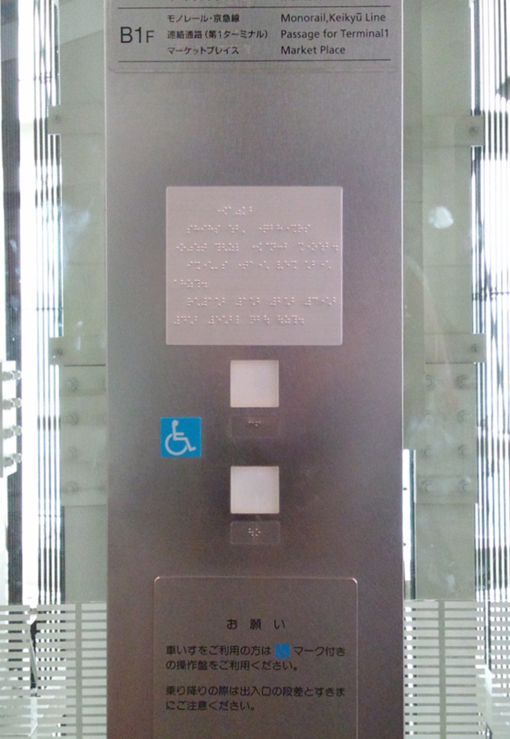訪日外国人向けの多言語案内と、段差に注意と書かれた点字パネルと、車いす利用者用のボタン案内でごちゃごちゃになった空港のエレベーターを思い出した。無表記のボタンだった。撮影した頃は「三角ボタンを使えばいいのに」と思っていたが、編集学校を経てねらいがわかった。掲示情報が多いので、その分ボタンをシンプルにして目立たせようとしたのだ。目が見える人に向けて地と図を反転させたのだと思った。