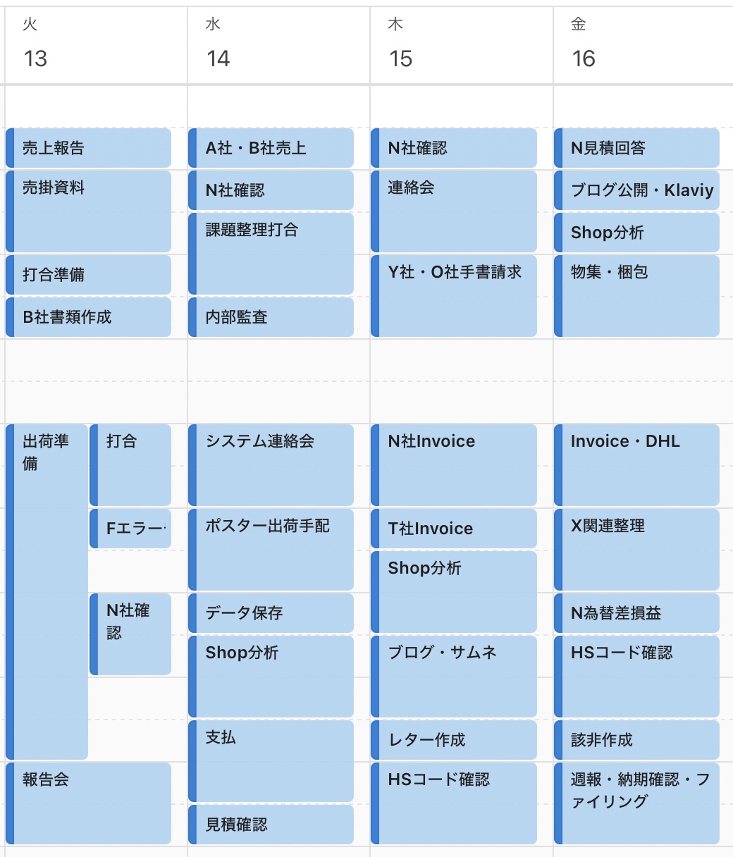 携わっている貿易の仕事は、締め切りが多い。出荷方法も海上、航空、国際宅配便、出張者託送とその都度違う。それが何件か重なることもある。日程の調整、商品調達の社内調整、売上げの記録、採算の確認、支払・入金の確認…それらが平行して進む。オンラインショップの管理など細々とした対応が必要なものもある。