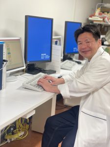 ▲笑顔で勤務中の松林医師。