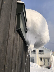 このエリアは、降り続く雪の中、屋根に登って雪下ろしをすることは難しく、また、敷地に余裕があるので、雪が自然と落ちるように三角屋根の家が多い。屋根に積もった雪は圧縮され分厚い板状の氷になって滑り落ちていく。下敷きになったらひとたまりもない。ある程度積もったら自然と落ちるので轟音が響いても順調と捉えればしめしめと思える。