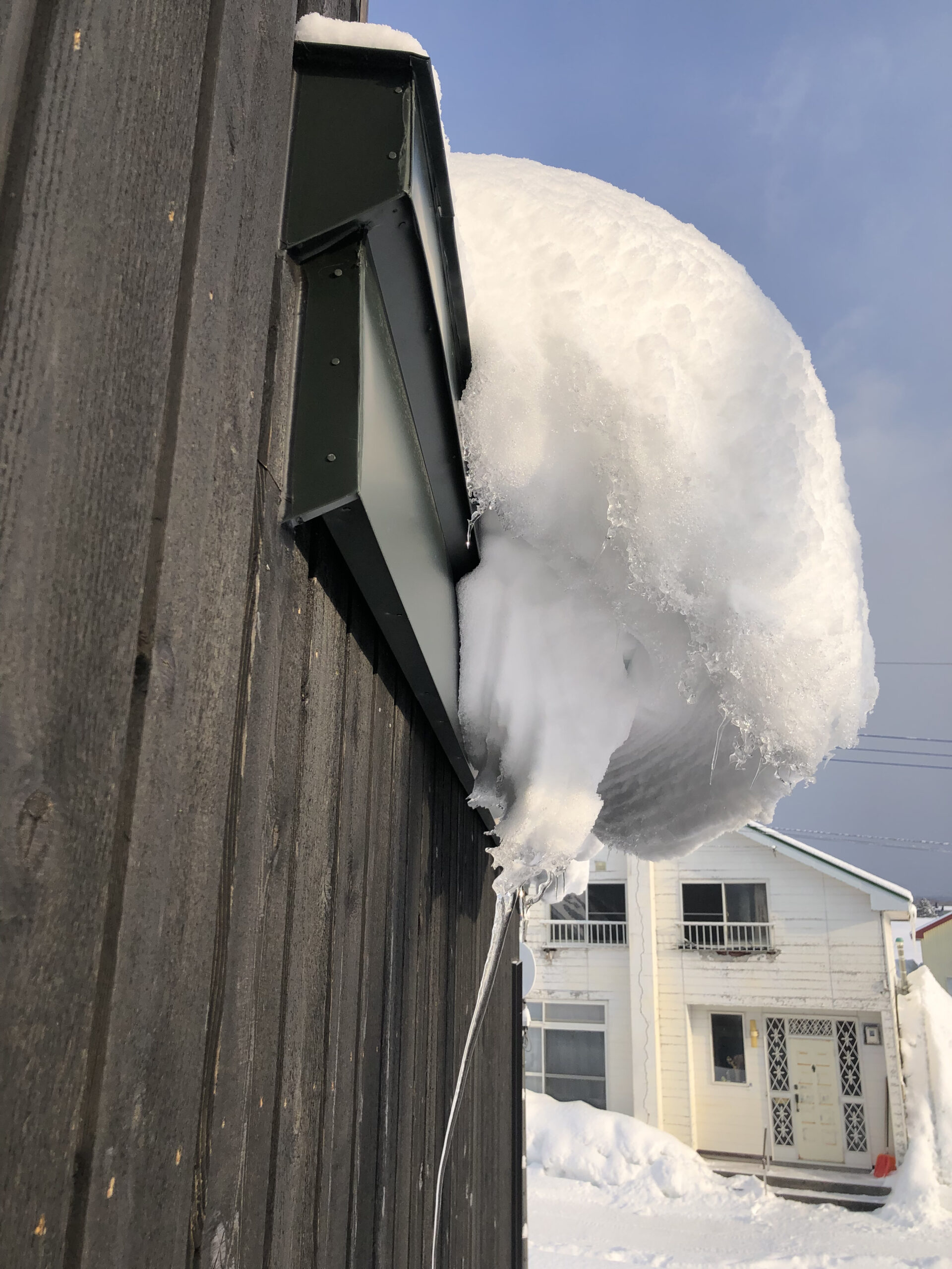 ところが、三角屋根のてっぺんの雪がどうにも引っかかって落ちてこないことがある。雪が降るほどにこの塊が成長し、オニオングラタンスープの器の縁にべったり貼り付いたパイ生地のように屋根のヘリに雪の塊が残ってしまうのだ。