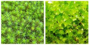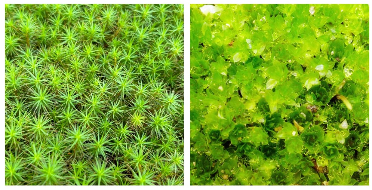 ▲さあ、どう分類しよう(左は旅先で見つけたスギゴケの仲間、右は自宅の庭のハリガネゴケ)