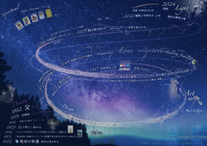 魂はどこから来てどこへ帰るのか? 物質的には、人は産道を螺旋状にくぐり抜け母の身体から生まれてくる。人の能力、人生も垂直ではなく螺旋上に、何度か同じ問題にたち返りながらも、レイヤーを重ねて以前とは違う意識でものごとに取り組む。自分の原型をカタチづくるのは、おさなごころ、育った環境。私はそれを暗い森の中に置いた。自身の歴象を、メインテーマとした螺旋上に配置し、終着点、松岡校長(図右上)の手元に「霊性は藝術の種」との言葉を置いた。大いなるものの存在、空中の精気、ギリシア語で言うプシュケー、そういったものをつかまえて人々に伝えたい。
