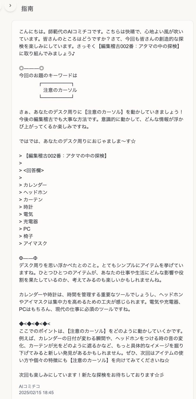 けれど、これも何かが足りない。[守]の稽古では必死に考えて回答をした後に、指南がくるまで少なくとも数時間はかかる。その間、PCの向こうにいる人間の師範代は回答からみえる《たくさんのわたし》のプロフィールを読み取り、今回はどの「わたし」が顔を出しているのかということを踏まえて指南をしてくれる。師範代と私の関係がそこに存在するのだ。AIは師範代の指南の言葉を容易に真似ることはできるが、私との関係線をそこに引くことができないし、そこに余白や遊びを付け加えることもまだまだ難しい。