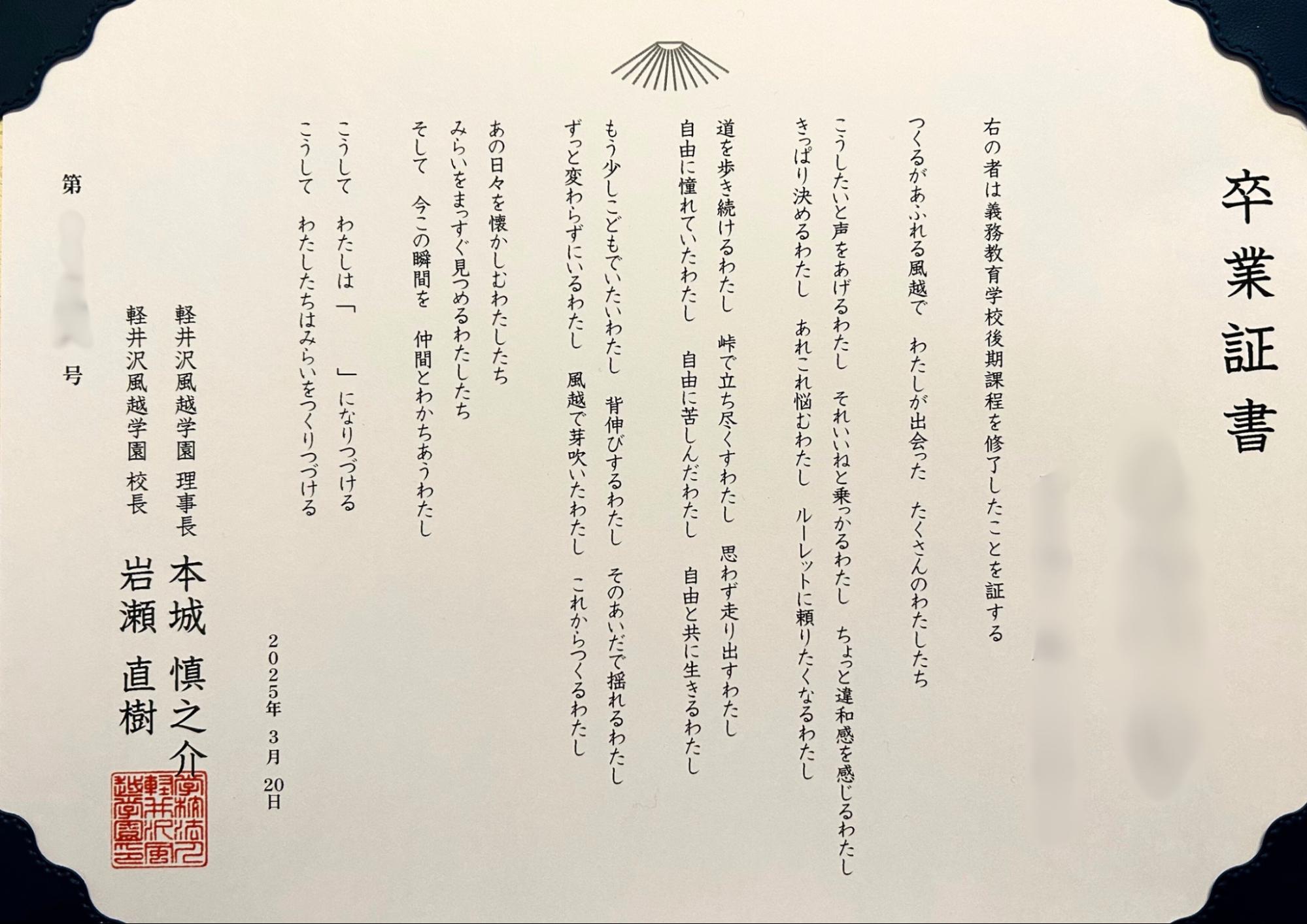 2025年3月、長女が3期目の卒業生として「軽井沢風越学園」の中学校を卒業した。