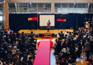 ▲25名の卒業生が一人ずつレッドカーペットを歩いて登場し、300名ほどの参加者を前に思いを語る。卒業証書を渡すスタッフは子ども自らが指名し、登場の仕方、音楽、服装、言葉、その全てにその子らしい編集が光る。