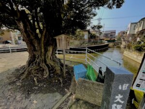 ▲水路に注目して地図を眺めると、住宅街の中に気になる用水の結節点を発見。足を運んでみると、加賀藩時代の「木揚場」の景色の断片の樹が佇んでいた。