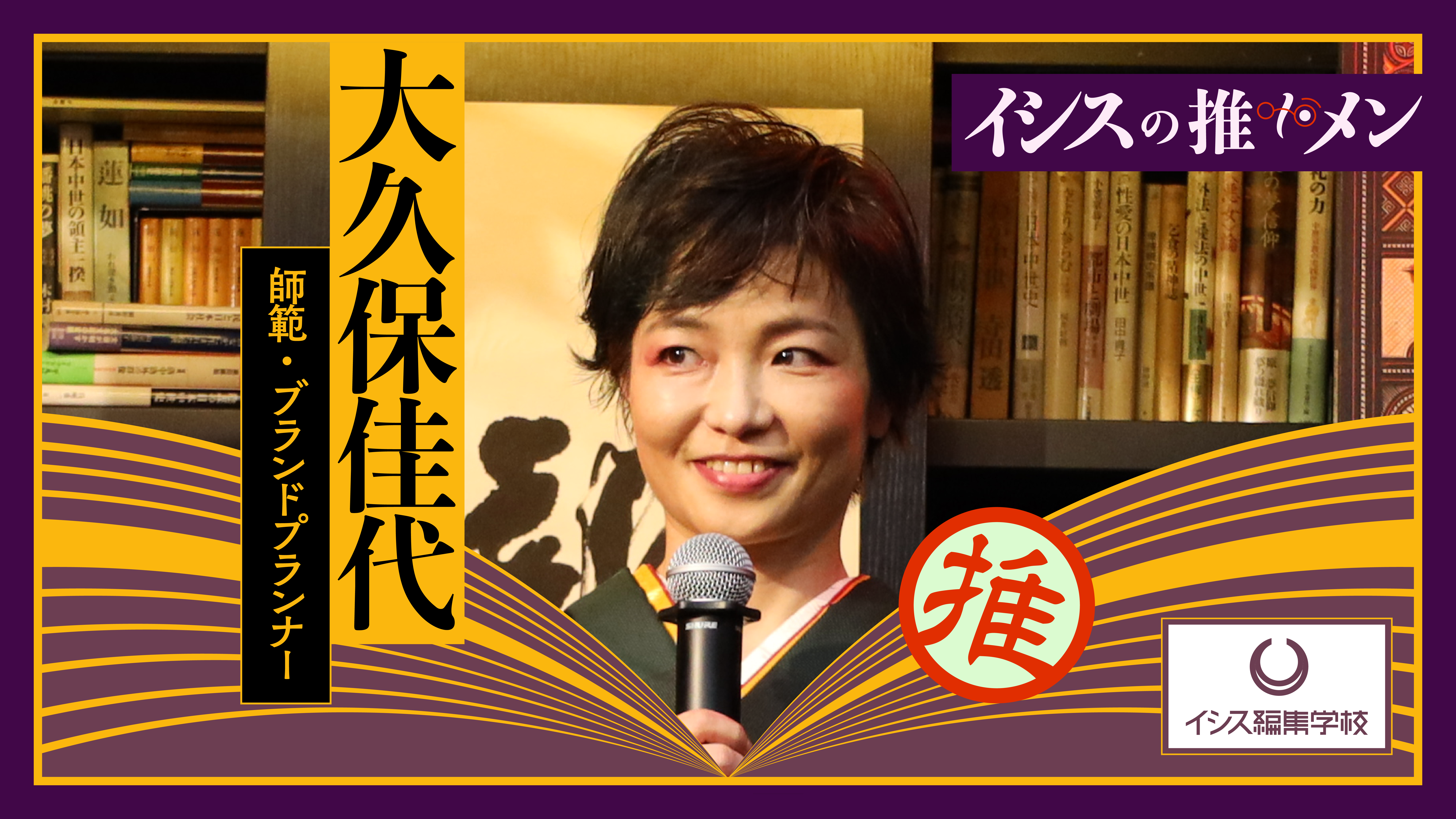 大久保佳代ブランド・プランナー。イシス編集学校には2010年、基本コース[守]24期入門。27[守][破]猫町たまたま教室師範代として登板。以来、世界読書奥義伝から物語講座、風韻講座からハイパー・コーポレート・ユニバーシティまで全講座修了。指導陣として、物語講座の師範代や師範も務めるほか、14[離]右筆、15[離]別番としても活躍。好奇心全開で相手を質問攻めにし、いつしか懐にちゃっかり鎮座するという不思議なコミュニケーション能力の持ち主。