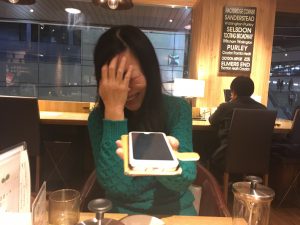 ▲インタビュー時の1コマ。山根師範のスマホはいつもバキバキに割れている。