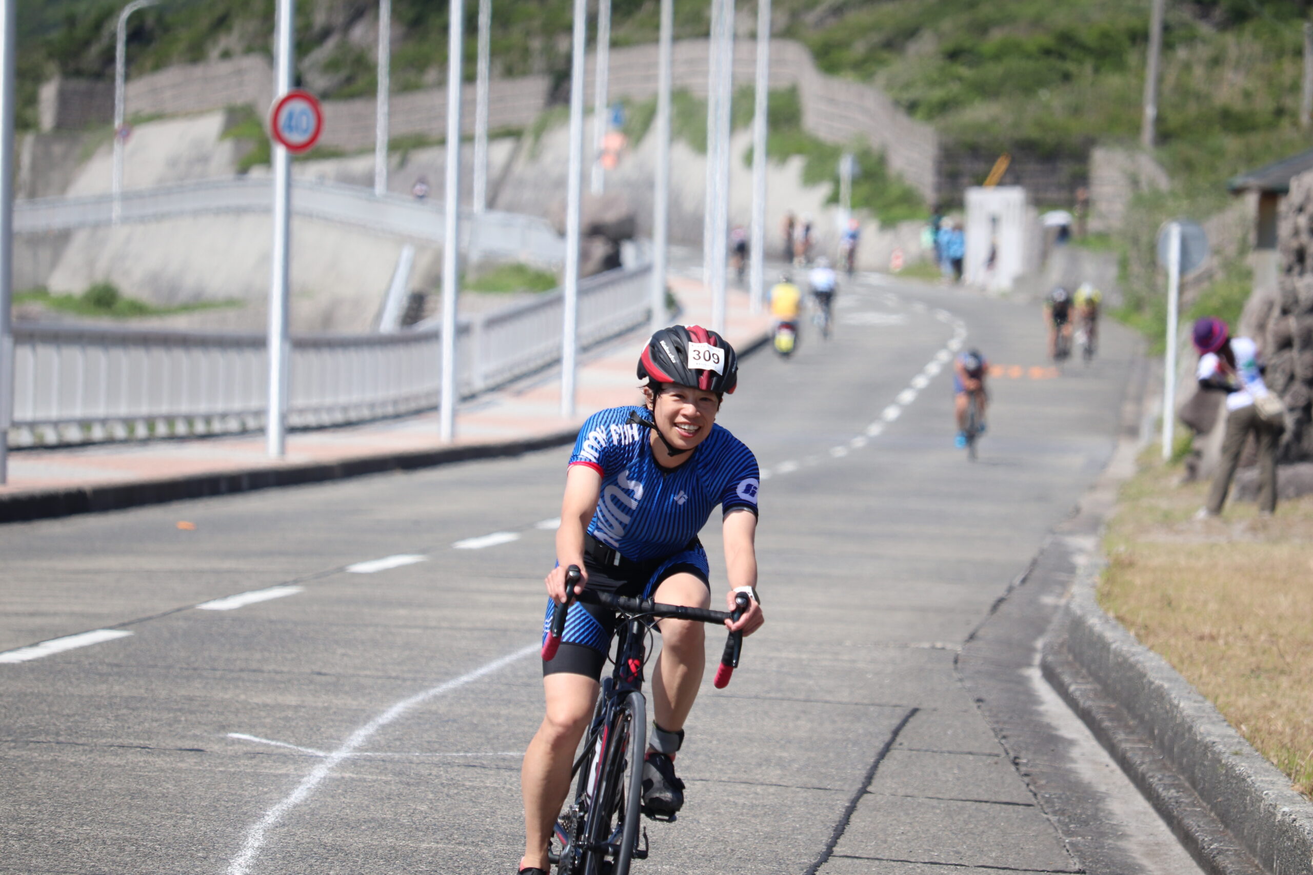 1.5kmの距離を辛くも完泳。次なるパートはバイク。新島の応援者の声と海の風がペダルにエナジーを与えてくれる。ひときわ「309~(さんまるきゅ~)」と私のゼッケン番号を言って声援を送るおっちゃんの声が耳に残る。さらに海の景色を目の前に速度45kmで坂道を下る開放的な気分に高揚する。笑顔でゴールテープを切りたい、ガッツポーズをする姿を思い浮かべた。▼海の風が心地よいバイクパート