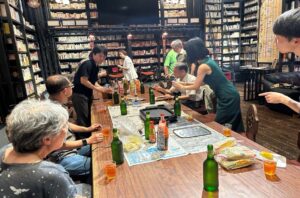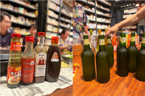 ▲李錦記のオイスター、京都祇園オジカ、A1、オタフクお好みソース。“映える”ように揃えられた緑の瓶ビール