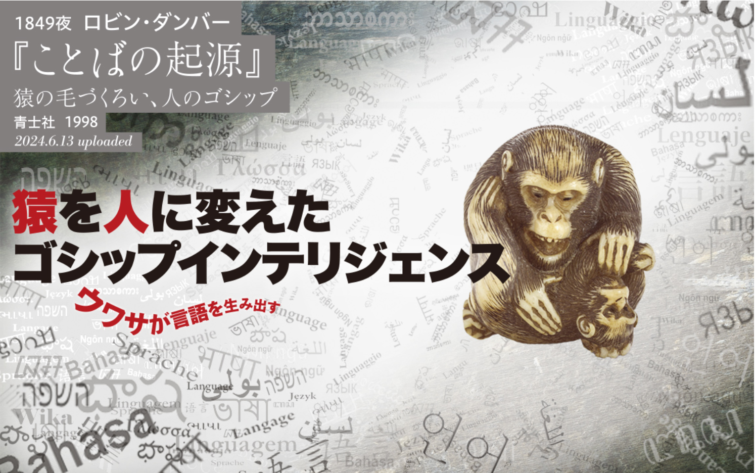 流言、伝聞、飛語、風説、風評、デマ、醜聞、ゴシップ、陰口、都市伝説、フェイクニュース、バズ。噂話は古代から中世、近代、現代まで世の中を翻弄し続けてきた。この噂やゴシップは、猿の毛づくろいに代わって言語と共に発生し、発達してきたという大胆な仮説を唱えたのが当夜の一冊だ。言語発生のいくつもの仮説を確認しつつ、編集工学が提唱するエディティングモデルの交換と重ねて考察します。