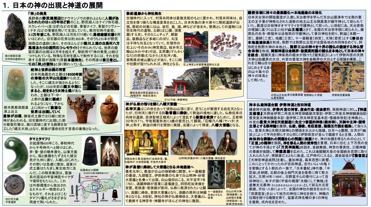 講義資料でもあるバジラ作成の図象。今回のテーマ「日本の神と神道」に関する歴史を一枚にまとめた。「”神”がいきなり出てくるわけがない。最初に”神”と言ったやつがいる」「日本は世界で最も古い神様をもった」「これを日本言語の発生と僕は呼びたい」など、松岡正剛に「学者10人力」といわしめるバジラ高橋の語りは広く速く深い。この図象での講義のあと、輪読衆による輪読が行われ、バジラの解説が重ねられていく。