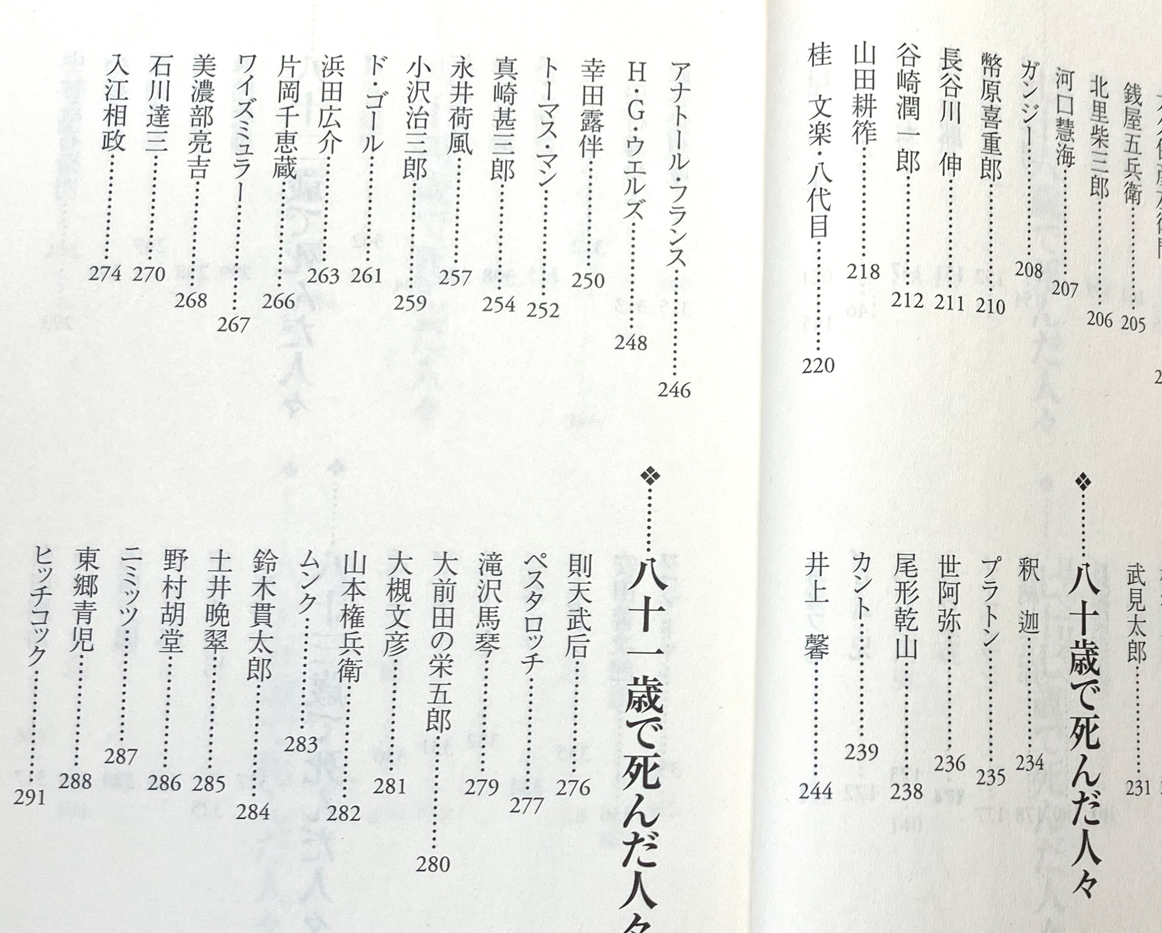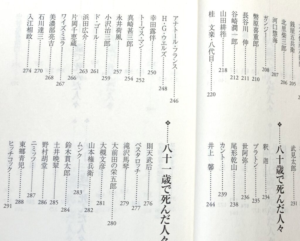 「八十歳で死んだ人々」のところを覗いてみると、釈迦、プラトン、世阿弥にカント・・・と、なかなかに強力なラインナップである。