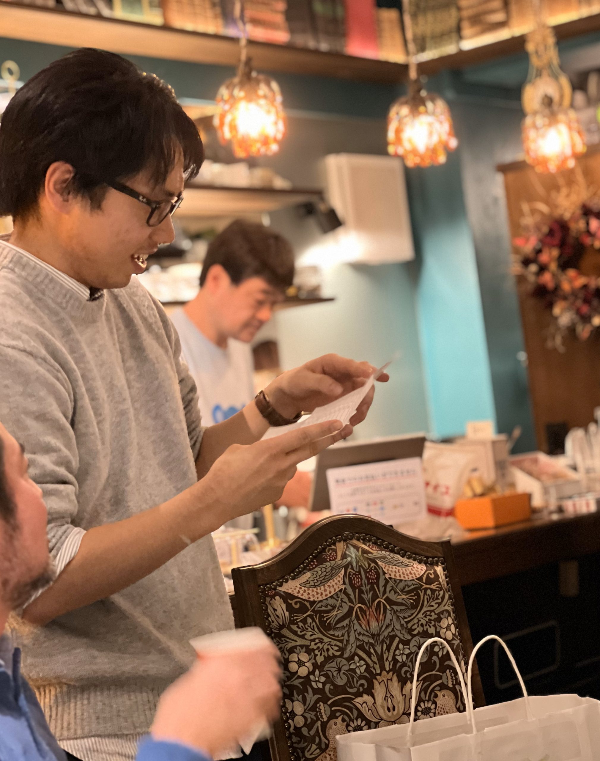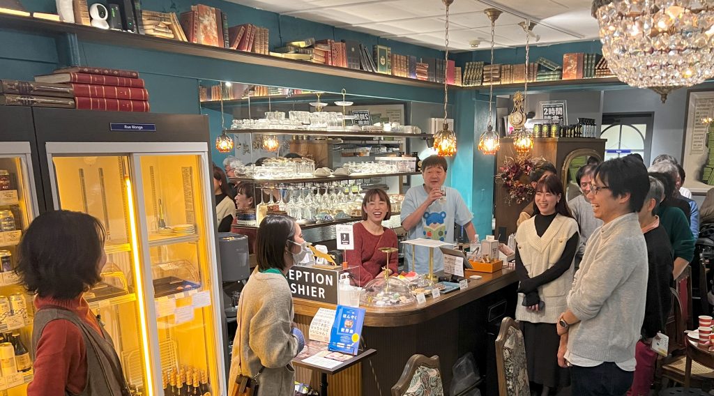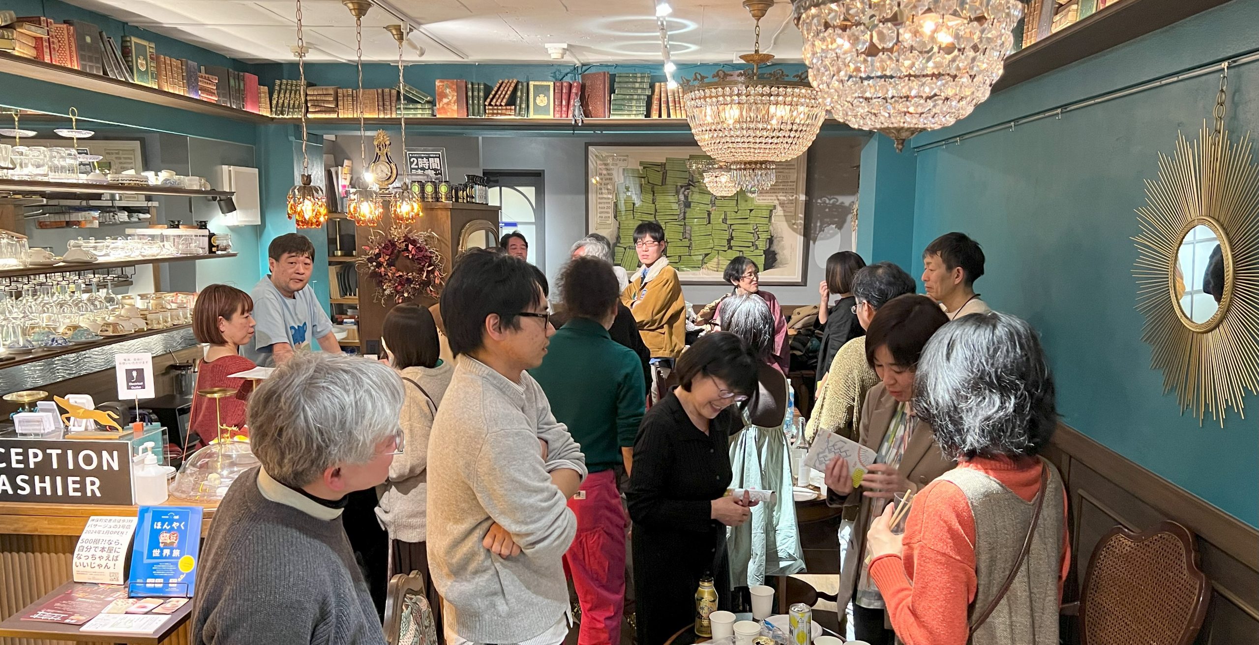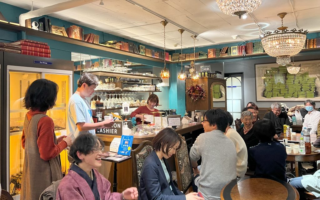▲青熊書店が入るPASSAGE by ALL REVIEWSの3FにあるカフェPASSAGE bis!にて。カウンターのなかで植田師範(カウンター手前)と岡村師範(カウンター奥)は、飲食の提供の切り盛りもしてくれた。二人と縁の深い参加メンバーが、二人との思い出にふれながら編集道のQ&Eを語る一場面。
