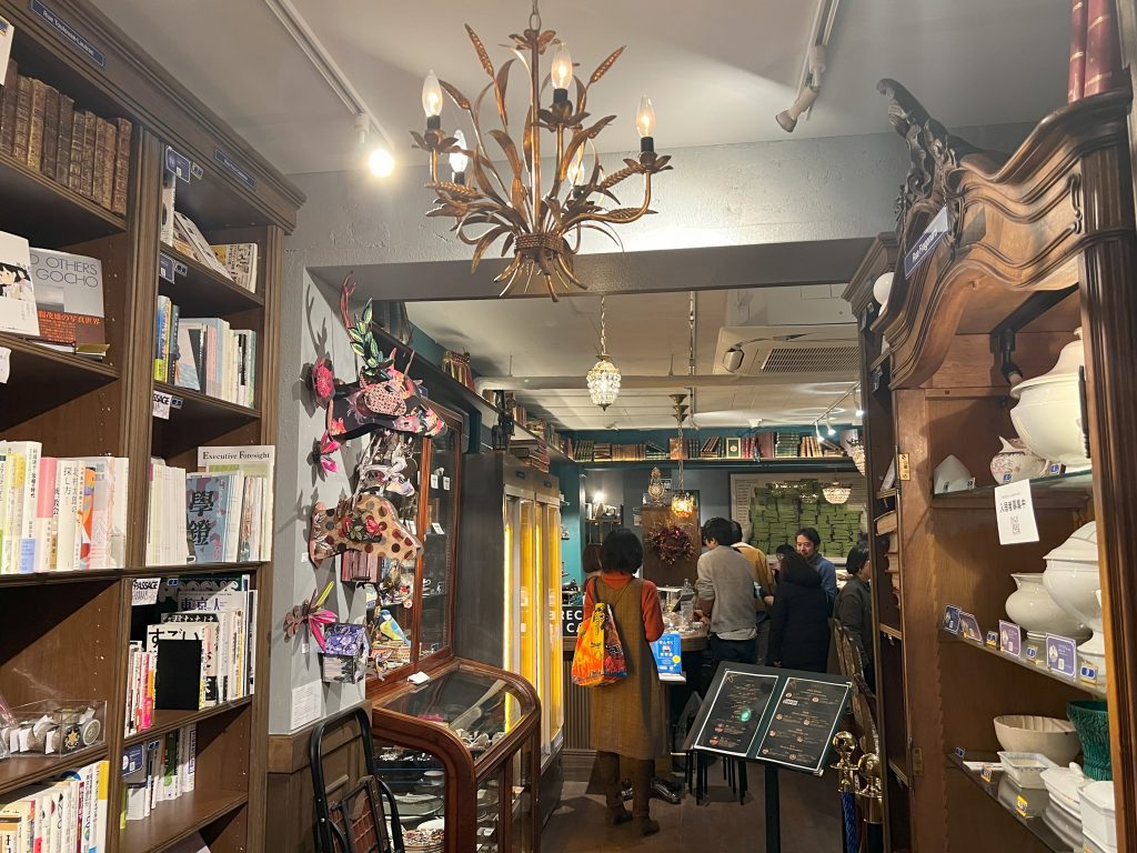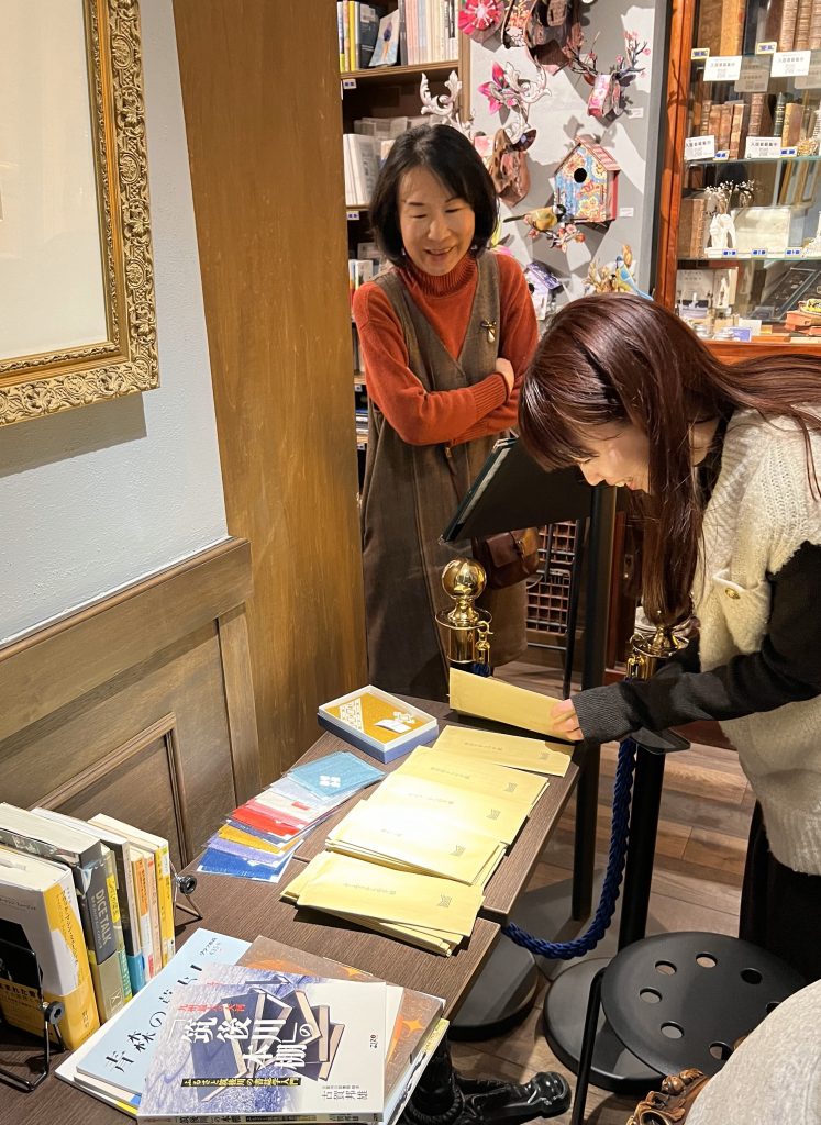 ▲店の一画には、青熊書店の出張販売所が設けられた。手前は、九天玄氣組を主宰する中野由紀昌組長が立ち上げた字像舎の新刊『「筑後川」の本棚』。奥の封筒には、たとえば「ライト係からの手紙」と表題がかかれ掌篇小説がおさめられている。じぶんの書いた物語にちなんだものがないかとみんなが手にとっていた。