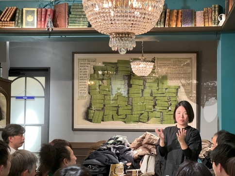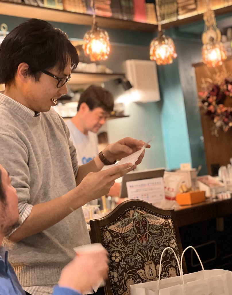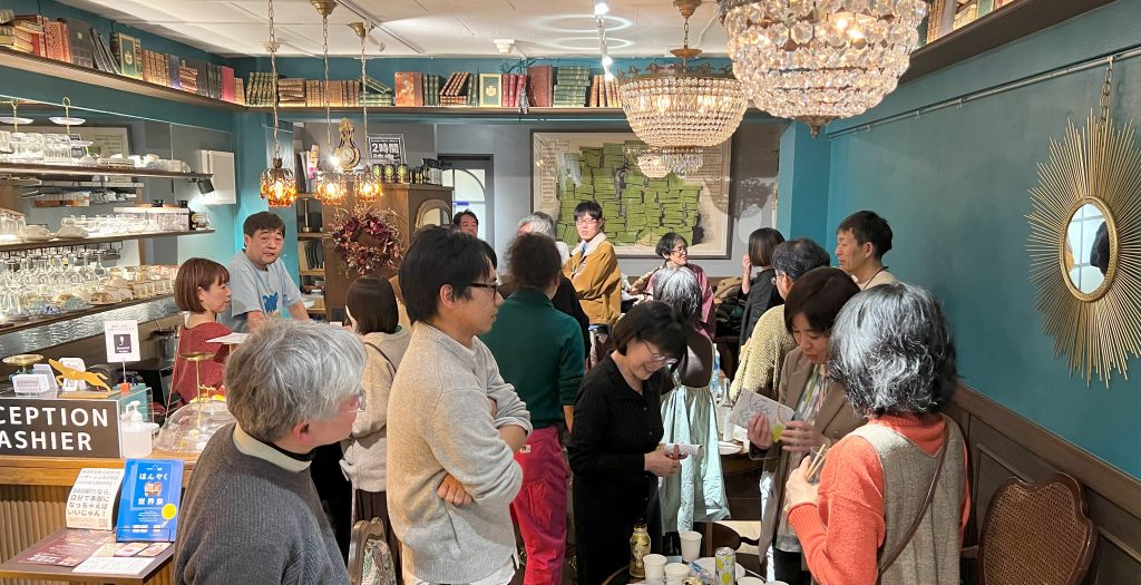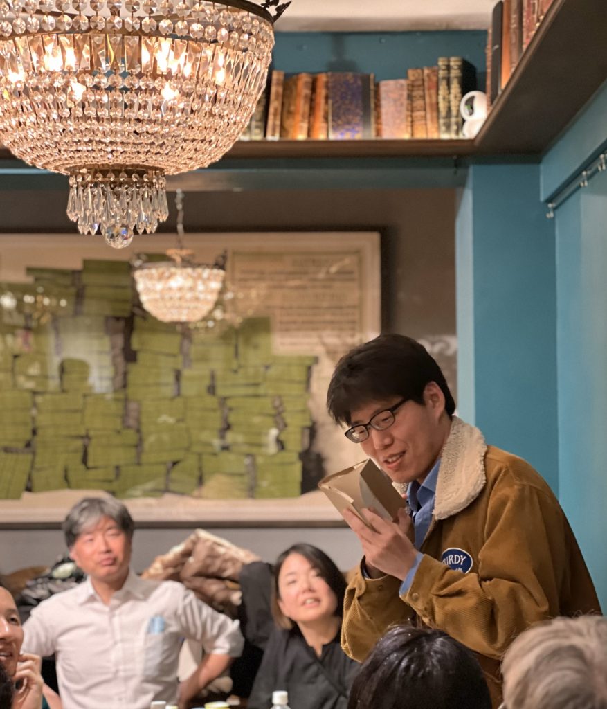 贈り本が全員にいきわたったあとは歓談タイムだったのだが、本の送り主のもとにすぐさま集い立ち話でそうとうに盛りあがった。お題とメッセージがパッケージとなった「ほにゃほにゃ」な贈り物がすぐさま炸裂して、意外な関係線をつないだ効果だったのだろう。