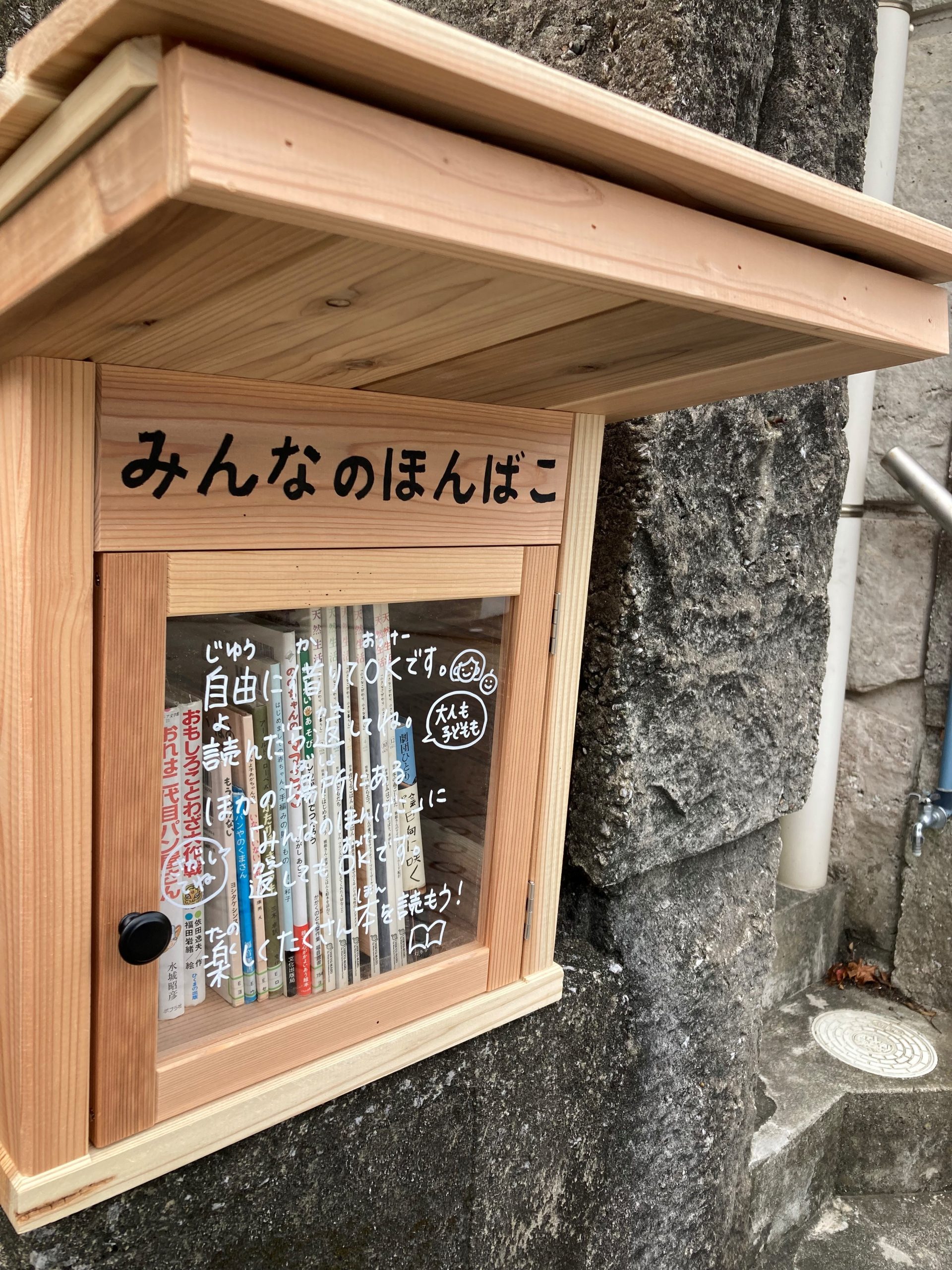 得原家の前に設置された”みんなの本箱”(「うみとやまのこども図書館」の活動の一環だそう)
