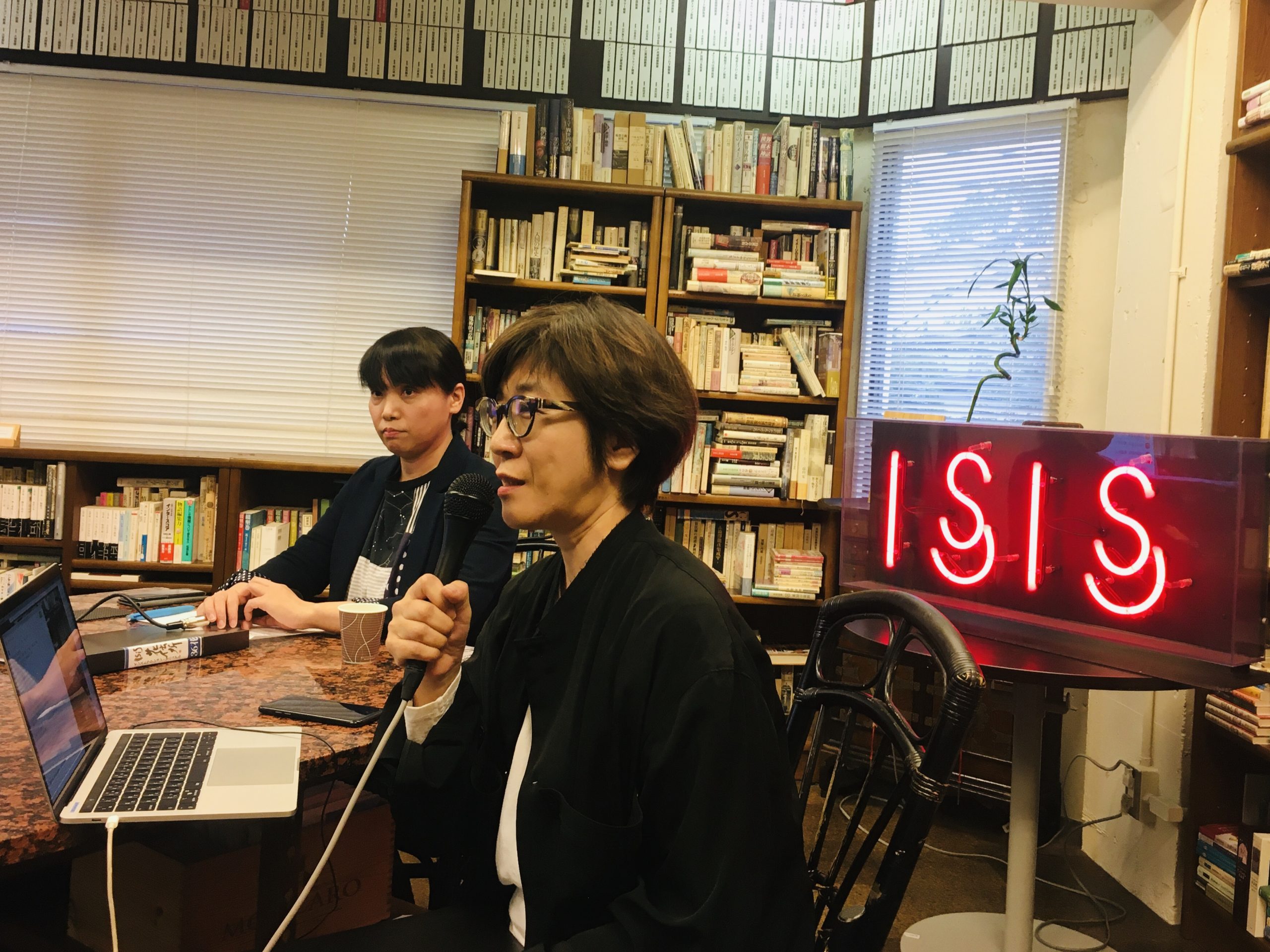 ▲二人目の花目付深谷もと佳は、美容師。みずからの営むサロンからメッセージを届ける。ガイダンスは、豪徳寺ISIS館2階「学林堂」から配信された。裏方Zoom担当は律師八田英子、ビデオカメラを構えたのはデザイナー穂積晴明。