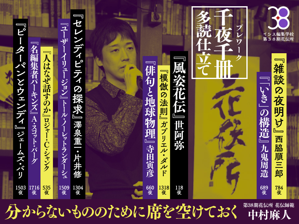 今、入伝生は千夜多読仕立てというお題に向かっている。10夜連なった千夜千冊から、[花]での気づきの可能性、つまり[花伝所]指導陣が込めた稽古方針をリバース・エンジニアリング(逆行工学)してみようというものだ。