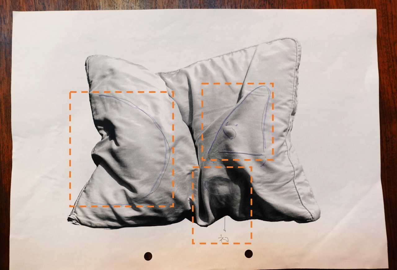 枕から「顔」に見えるところを見つけて描き出してください。