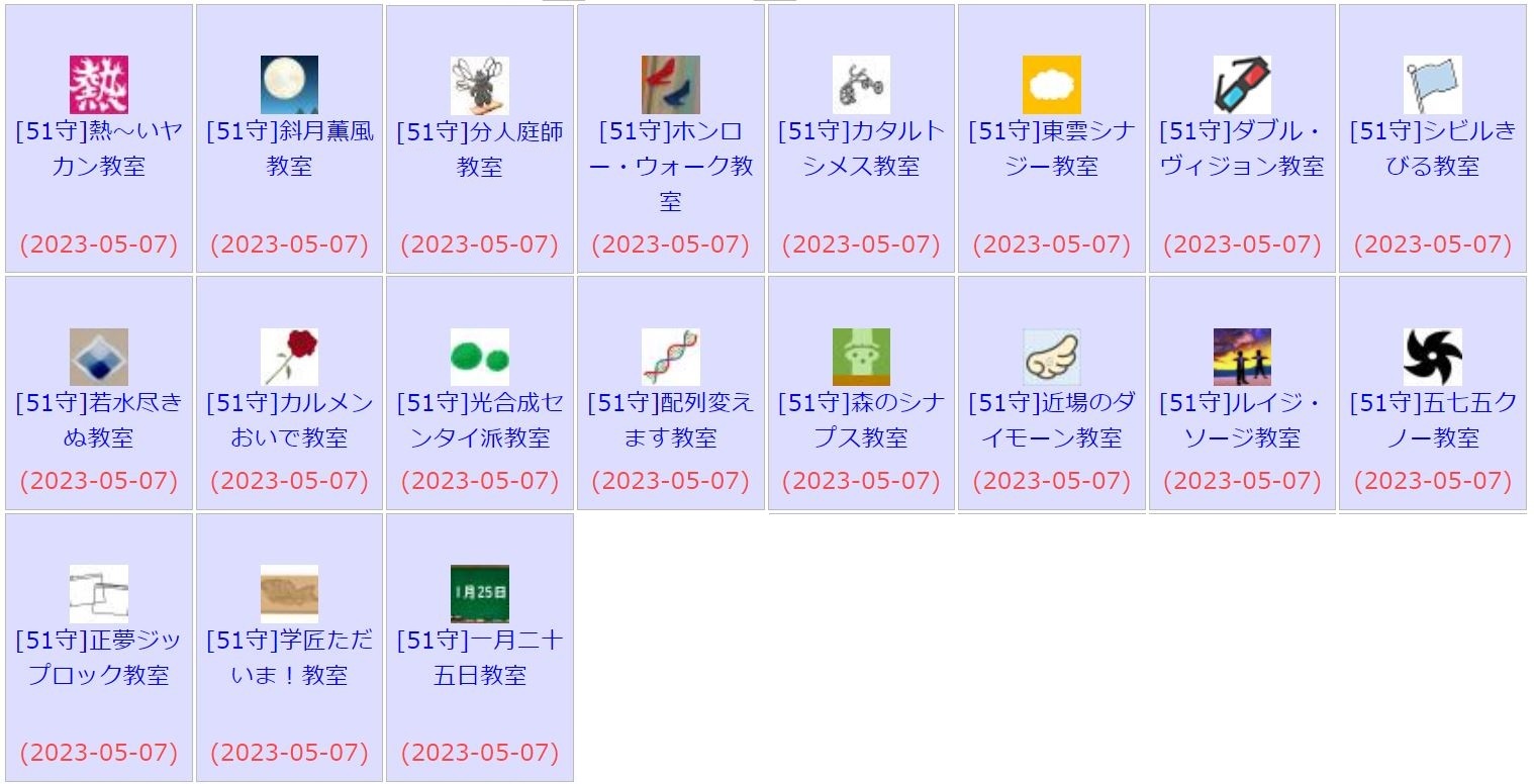 一人の事件に、仲間が駆けつけ、編集の機になり、追い風にもなる。イシスの光景は連休中であっても変わらない。51[守]の19教室全ての教室アイコンが揃い踏んだ。茶事において、亭主はその場の出会いを尊び、茶碗はもちろん、菓子、道具の一切、床の間の花や軸、あらゆる構成要素を入念に設える。しつらいが尽くされることにより、亭主のもてなしも、客人のふるまいも、いっそう場に引き出される。稽古の充実への祈りを込めて、師範代が掲げた教室アイコンに護られ、いよいよ51[守]の開講だ。