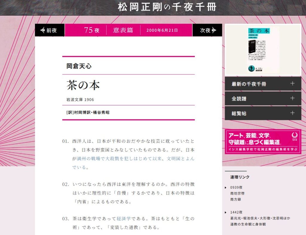 私にとって『茶の本』というのは薄い一冊ですけれども、とても象徴的で、エポックメイキングな忘れがたい本になっています。それゆえ「千夜千冊」を書いたときも、何度も『茶の本』に戻るというようなことをいたしました。たとえば、西行、芭蕉、世阿弥、さらには海外のプルーストとか、ジャン・コクトーとか、そういう本を取り上げるときも天心に戻ってというか、天心と比較してといいますか、そういうことを何度もしたわけです。ー 「原点となる『茶の本』」(松岡正剛)より