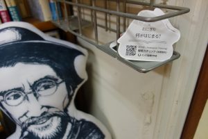 参加者はまず2階の学林堂へと案内され、福井に出迎えられる。19時30分の開始まで参加者と軽やかな談話が行われた。編集力チェックに話題が及ぶ。すぐ近くのコースターの裏側のQRコードを紹介した。実は編集学校の師範代からの指南を一部、無料で受けることが可能なのだ。