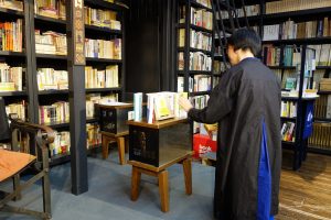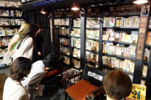 2Fから1Fの本楼へと移動し、日本に特化した2万冊の本棚紹介が行われる。一通りの説明の後、今回のエディットツアー参加者が驚くトビキリの作品がすぐ傍に隠されていたことを告げた。なんと、校長が数時間前に書きあげた「書」が乾かされていたのだ。本棚説明のことを一時的に忘れて、生々しい筆の痕跡に食い入る参加者たち。本楼という書物空間に紐づけられた「書」たちを一生の思い出にするに違いない。
