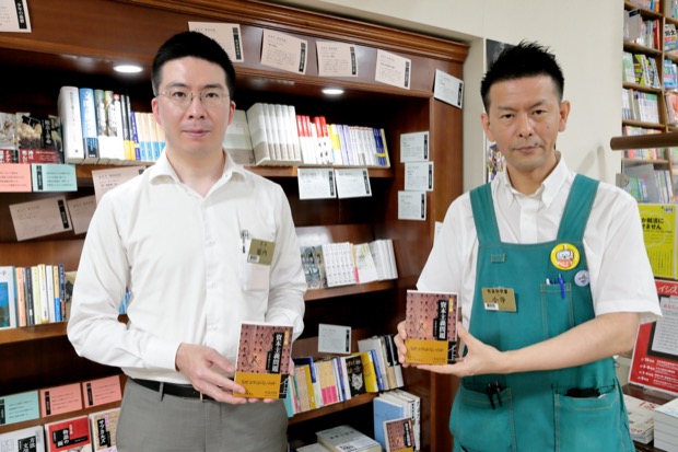 (左)堀内店長、(右)小寺さん 最新エディション『資本主義問題』を手に。