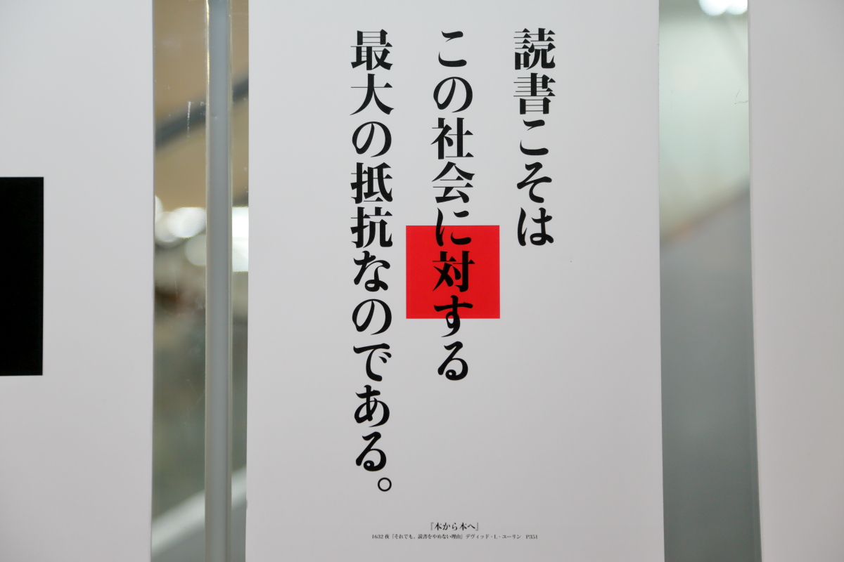 約2mのガラス壁を2枚に渡って埋め尽くすパネルは、全28枚。各パネルは2枚一組、両面。それぞれ、字紋と各エディションからの引用文があしらわれている。引用文のセレクトは、竹島陽子・敷田信之・阿曽祐子・景山和浩・網口渓太らチーム大阪の面々。デザイン・制作は野嶋。野嶋は、A3両面糊3mm厚パネルを2つにカットし、貼り損じたものを手ピカジェルで剥がしながら、両面あわせ56面のハレパネ貼りを完遂。売り場を訪れる人が思わず足を止め、読みこむ姿がよく見られた。
