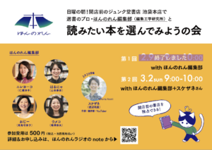 ジュンク堂書店 池袋本店1階での「ほんのれんフェア」開催にあわせて、「選書のプロ・ほんのれん編集部と読みたい本を選んでみようの会」を行います。