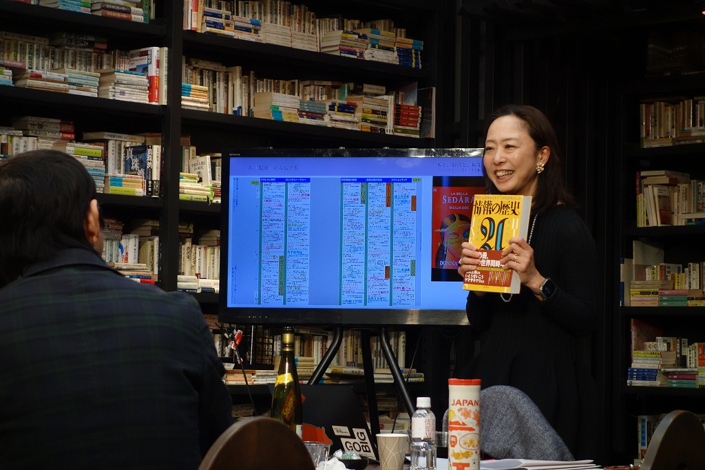今回選んだ白ワインと赤ワインのルーツについてのトークが始まります。『情報の歴史21』の1640年と1800年のページを交えて、ワインの本場であるフランスの歴史情報も辿りました。途中、金井が無人島に1冊だけ持っていける書物として、『情報の歴史21』を選ぶことを強調しました。歴史情報の間に関係線を引くことで、10年間は飽きずに読めることを豪語します。加えて、政治と軍事の手腕に優れたマリーアントワネットの姉(マリア・カロリーナ・ダズブルゴ)がルイ16世に嫁いでいたらフランス革命が起こらなかった、というIF世界の物語を創りながら遊べることを語りつつ、書物を抱えていました。