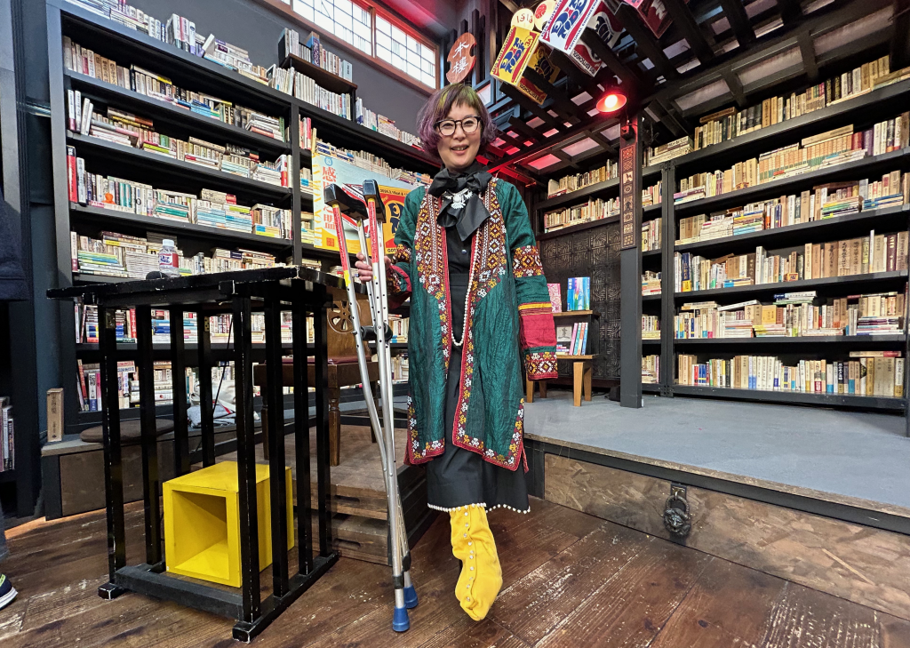 この日の司会は森山師範だ。2012年に開催された松丸本舗で、ブックショップエディターとして本と人をつないだ。「資生堂のSEだったんだよね。本当は着物の名人だけれど足を怪我して今日は洋服での登場です」と松岡校長が声をかけると、その人はゆっくりと立ち位置を選び、マイクを持った。森山はトルクメニスタンの刺繍のエキゾチシズムを羽織り、怪我した足を山吹色のブーツに包む。七色に染まった髪の艶やかさはZOOMの画面でも目立ったようだ。「髪のグラデーションが素敵です」とチャットが届く。着物を封印した森山師範の踵にビビの入った足を守るブーツは、息子のお古をリメイクしたお手製だ。