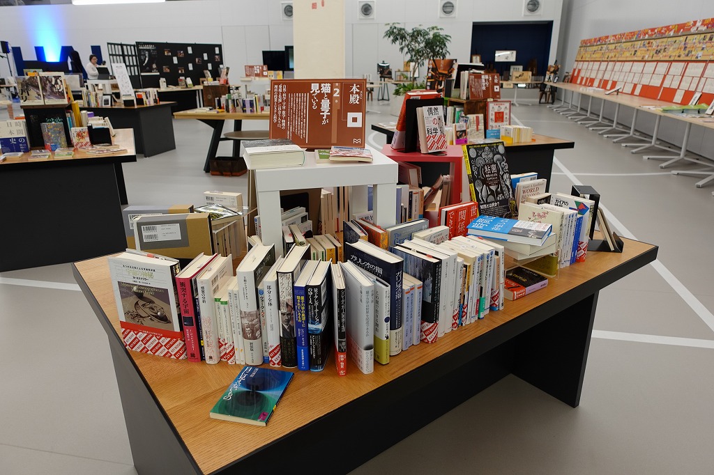 前回と異なり、第84回感門之盟はリアル参加限定開催で、各種講座の受講者やOB・OGたち200名を超える方々が参加していますね。今回はなんと、伝説の”松丸本舗”が限定復活しています。求龍堂版「千夜千冊全集」の7巻それぞれをベースにして選書された書籍達が並び、隣り合う本同士の属性や意味が関係づけられつつ、魅せる本棚として再構築されています。さらに当時のブックショップエディターがエプロンを纏って、来訪者の特徴やメッセージを読み解きつつ、書物を紹介しているのです。