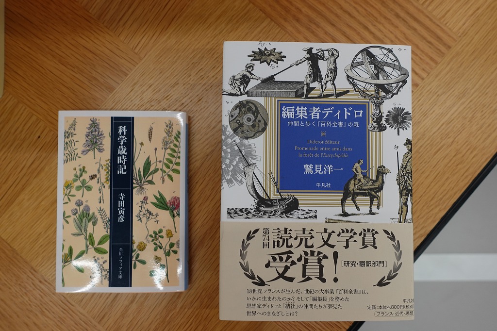 大音はTさんのスタジオネームと理系属性から連想を行い、第2巻「猫と量子が見ている」の本棚を案内しました。宇宙から始まり、時間、そして生物の本を紹介し、押しの一冊として、科学と文学を調和させた随筆集である寺田寅彦『科学歳時記』(角川書店)を勧めました。サイエンスなアナロジカル思考が深まりそうです。隣にいたハタモトに対しては求龍堂版の千夜千冊に匹敵する巨人っぽい鷲見洋一『編集者ディドロ:仲間と歩く『百科全書』の森』(平凡社)を紹介しました。きっと突破デーを乗り越えた師範代に対する労いの書物だったのです。