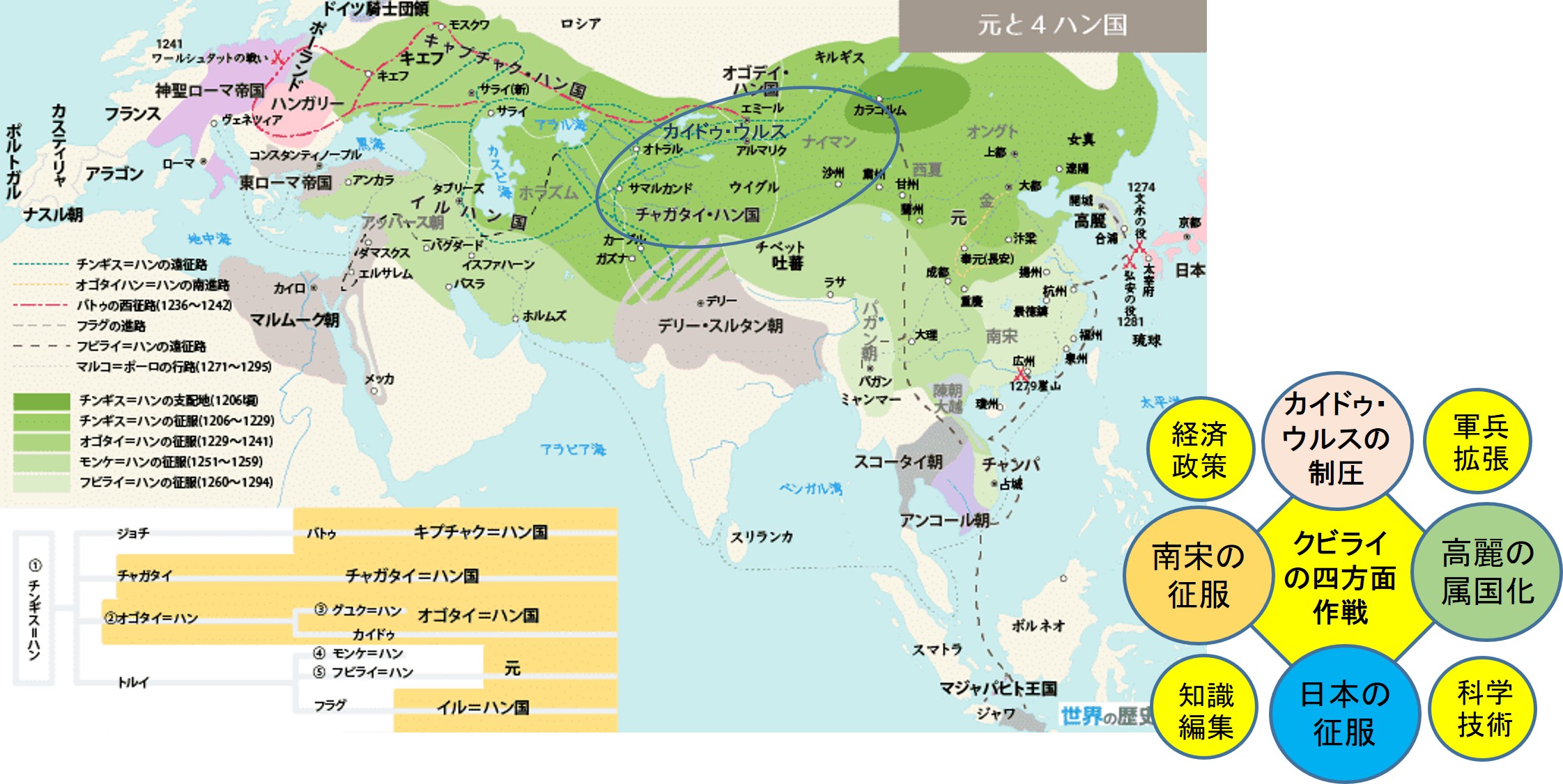 クビライは即位後、高麗の属国化、南宋の征服、カイドゥ・ウルス(モンゴル国家)の制圧、そして日本への征服と、大きく4つの施策を掲げていた。これらは同時に行われたわけではない。1268年には高句麗遠征への協力のために日本に対して親書「大蒙古国皇帝奉書」を鎌倉に届けていた。しかしながら、外交権を持つ朝廷は返書を出さず、クビライは施策に基づき、日本への征服を決め、元寇(文永・弘安の役)へとつながっていく。