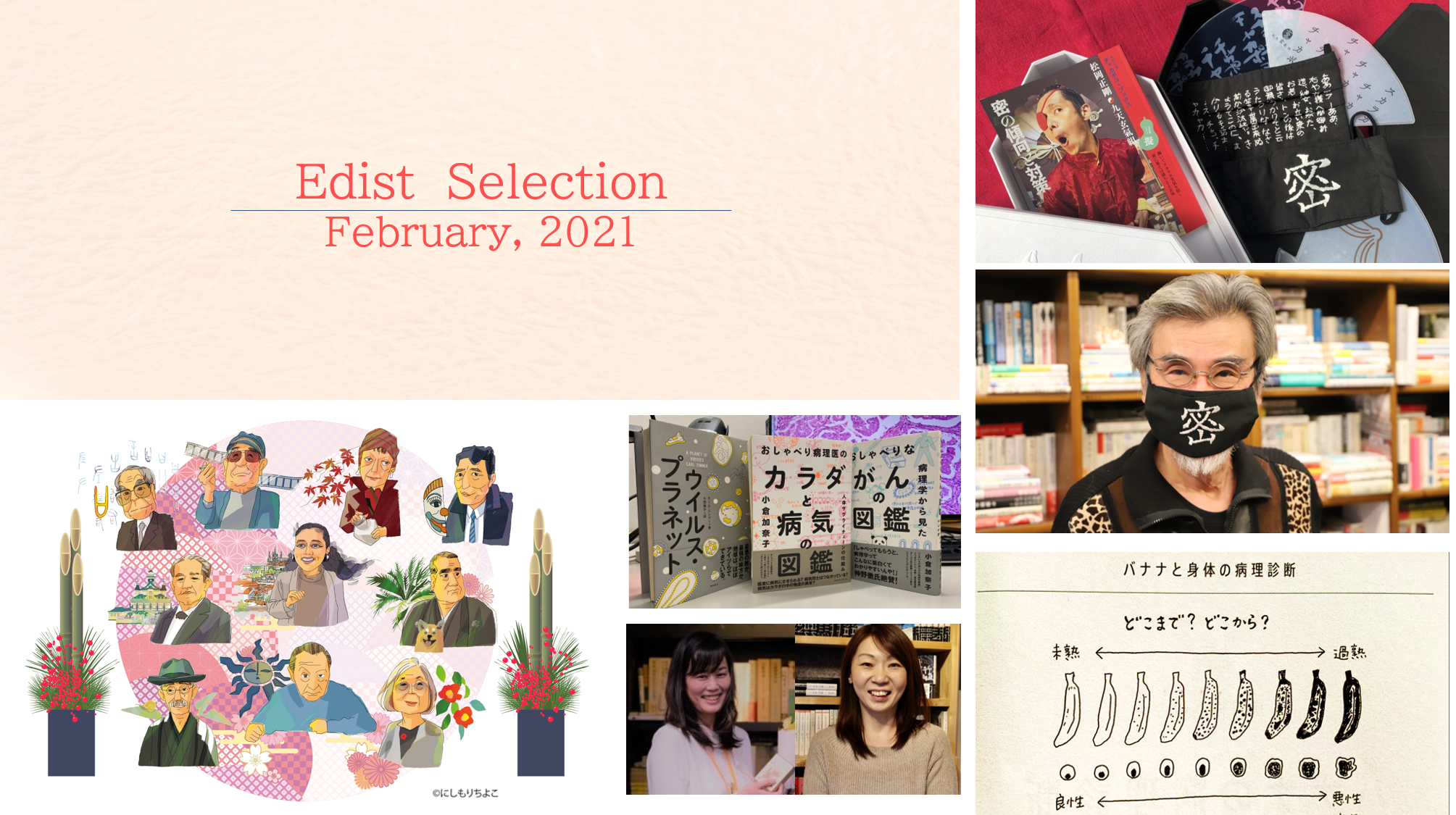 「あいだのコミュニケーター」松原朋子、「進化するMr.オネスティ」上杉公志、「職人肌のレモンガール」梅澤奈央、「レディ・フォト&スーパーマネジャー」後藤由加里、「国語するイシスの至宝」川野貴志、「天性のメディアスター」金宗代副編集長、「諧謔と変節の必殺仕掛人」吉村堅樹編集長。エディスト編集部七人組の顔ぶれ。