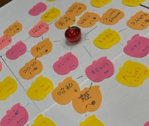 参加者Eを含む4人は、ものの5分でリンゴの連想ツリーを広げていった。紙が足りなくなり継ぎ足している。