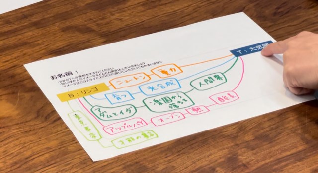 参加者Eが作成したワークシート。リンゴから大気圏へ、連想が方向性をもって広がる様子を図解した。