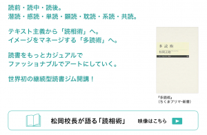 <多読ジム>は、編集学校の校長・松岡正剛の著書『多読術』(ちくまプリマー新書)をもとに開発され、2020年4月からスタートした読書術コースです。「ジム」というネーミングのとおり、フィットネス感覚で読書を楽しむことができます。ストレッチのように軽くトレーニングすることも、自分の力に合わせて負荷をかけていくこともできるようにコース設計されています。