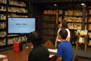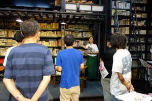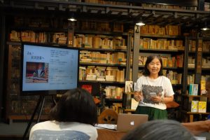 本楼の本棚紹介が行われ、参加者たちは目次読書をするための書籍を5分以内で選ぶ。読書術のネーミングに相応しく、目次の充実した新書が推奨されていた。その後、参加者は石井によるナビゲーションを受けながら、目次の中のキーワードを取り出しつつ、高速で読みを進めていく。提示された方法の型に沿って内容をまとめ、最後のワークでは3名ごとのグループに分かれて5分間隔で1名が本の紹介を行い、他2名がコメントや感想を述べた。たった15分で3冊の書物を読めたことになる。