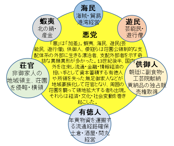 両座衆のコメントに出てくる「悪党」。この「悪」は今想起される「悪」とは異なる。BADではないのだ。対となる「善」は生きていける状態、衣食住には困らない状態のことであったが、やがて“生存に無関係なもの”がどんどんと増えていった。それは人間の欲望だ。その欲こそが「悪」であり、表現を変えれば経済を振興させてきたものがここでいう「悪」なのである。