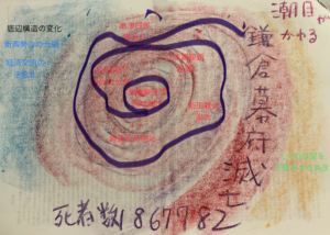 K座衆:「潮目が変わる、鎌倉幕府滅亡に一気に進んだことが印象的だった様子を色分けした。底辺構造が変化し、悪党、新興勢力の台頭など、いろんなものが流動化して、不信感が醸成されてから雪崩をうつように進んだと感じた。前回の輪読テキストで亡くなった人の数をかぞえたらものすごい数だった。体制が変わるのには犠牲が伴うことを実感した。今も、国よりも力を持つ企業があるなど、世の中の流れのほうが進んで国の制度が追い付かなくなっていることもあるように思う。」