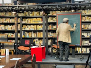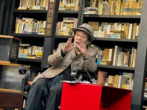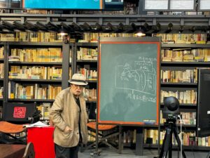 バジラと連絡がとれた林頭が「バジラさん、あと5分で着くって」と言った時、時計が示したのは“12時58分”という情報だった。輪読座は今期より本楼とZOOMのハイブリッド開催で運営している。本楼の座衆はバジラ高橋が不在であることにもちろん気付いているが、ZOOM参加で既にログインしている座衆は知る由もない。13時になるとバジラ高橋は不在のままにZOOMの音声は配信され、林頭がマイクを持ちオープニングトークを始める。通常はオープニングトークは実施していないから、完全にアドリブである。9月に実施する感門之盟の告知を始めるや否や、本楼裏手の扉がギィとひらく。バジラ登場である。胸を撫でおろすスタッフ陣。林頭からバジラ高橋に主体が動く。そもそもエディスト隊で参加していたはずなのにいつの間にか輪読座のメインスタッフと化し、今では進行もこなす福井千裕が輪読師とコミュニケーションをとりながら場を仕立てていく。